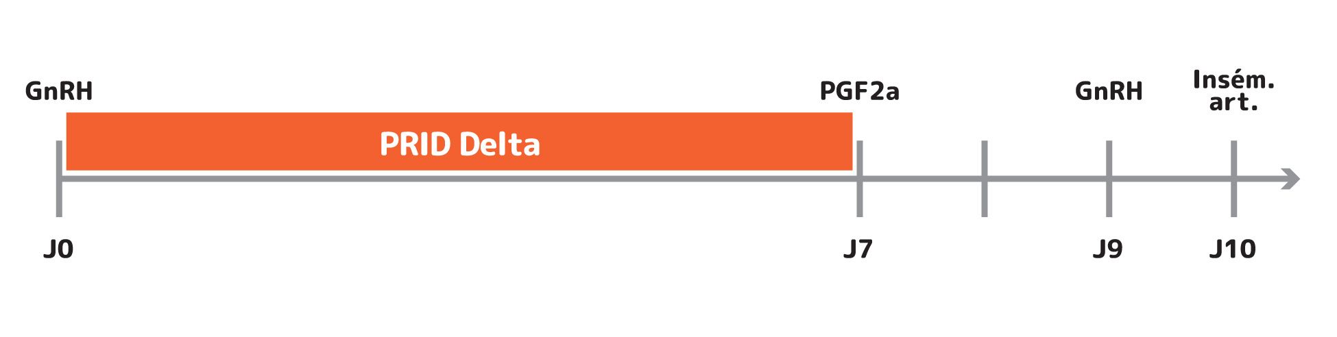 Il existe plusieurs protocoles de reproduction pour les bovins. Le dispositif PRID Delta peut être utilisé avec la plupart d’entre eux. Communiquez avec votre représentant de Ceva pour discuter de la meilleure façon d’utiliser le dispositif PRID Delta avec votre troupeau.